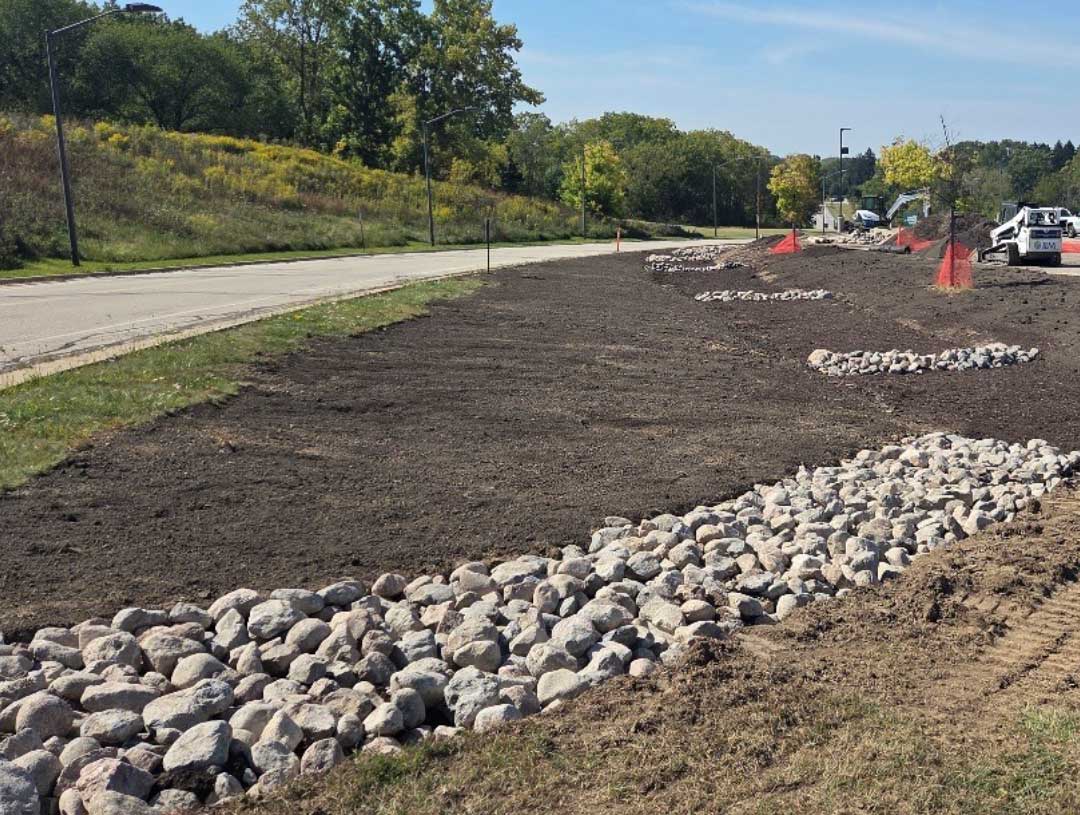 This stormwater landscaping project was designed to reduce pollution found in stormwater runoff in the Pike River Watershed. Phase 1, which was completed in 2025, occurred at the intersection of Parking Lot C and University Drive on the south end of the UW-Parkside campus. The project included a regenerative stormwater conveyance system, which was comprised of large boulders and mulch surrounding the stormwater drain, as well as native plugs and stormwater trees. The project area will receive continued maintenance from the terrestrial team through 2027.